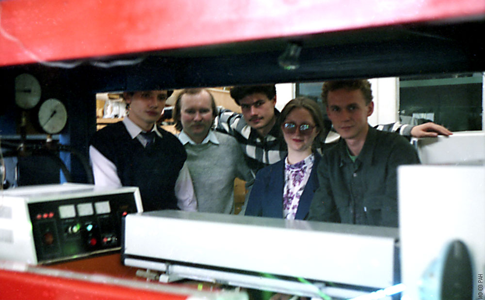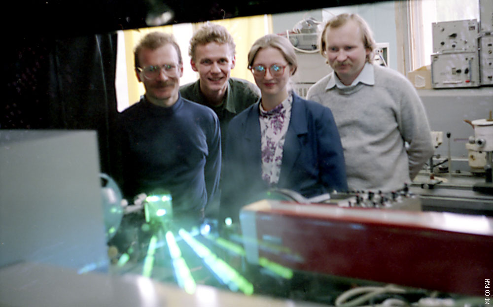 Сотрудники лаборатории молекулярной спектроскопии Института физики им. Л.В. Киренского Сибирского отделения Российской академии наук (ИФ СО РАН). Слева направо: Крылов А.С., Пресняков В.В., Афанасьева С.Н. (Крылова С.Н.), Втюрин А.Н. Снимок 1996 года. Красноярск.
