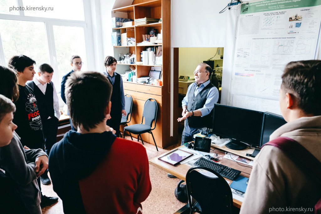 В конце октября 2022 года в Институте физики им. Л.В. Киренского Сибирского отделения Российской академии наук (ИФ СО РАН) для учеников школы № 10 имени академика Ю.А. Овчинникова – базовой школы РАН по направлению подготовки «физика» – прошли памятные чтения, посвященные празднованию 100-летия со дня рождения нобелевского лауреата Басова Николая Геннадьевича. На снимке: Крылов Александр Сергеевич, кандидат физико-математических наук, старший научный сотрудник лаборатории молекулярной спектроскопии Института физики им. Л.В. Киренского СО РАН познакомил ребят с таким перспективным направлением, как изучение жидких кристаллов и где они применяются. Красноярск.