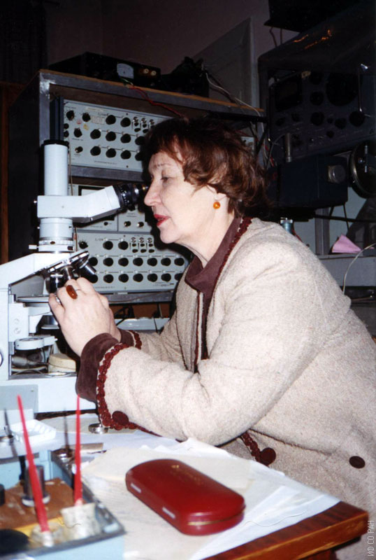 Мельникова С.В., старший научный сотрудник лаборатории кристаллофизики Института физики им. Л.В. Киренского Сибирского отделения Российской академии наук (ИФ СО РАН), за поляризационным микроскопом, октябрь 2001 года. Красноярск. Академгородок.