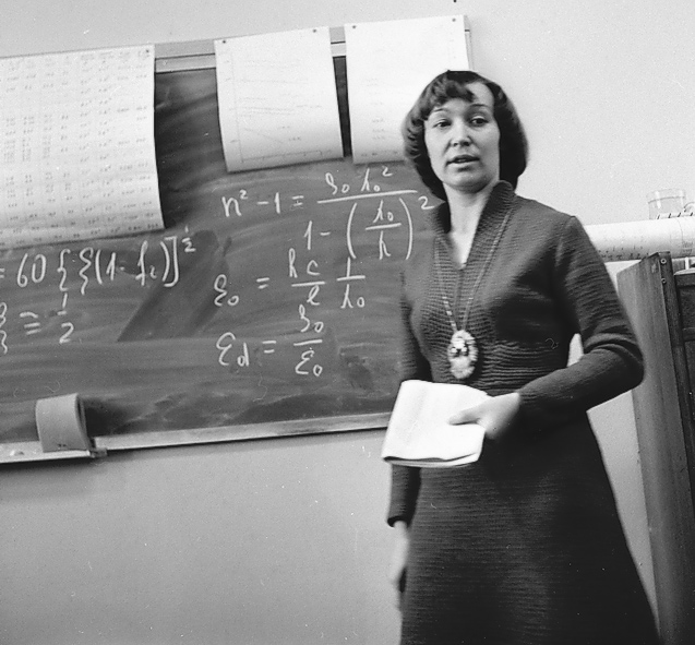 Мельникова С.В., младший научный сотрудник, кристаллооптик лаборатории кристаллофизики Института физики им. Л.В. Киренского Сибирского отделения Академии наук СССР (ИФ СО АН СССР), выступает на семинаре лаборатории кристаллофизики, фото 1975 года. Красноярск.