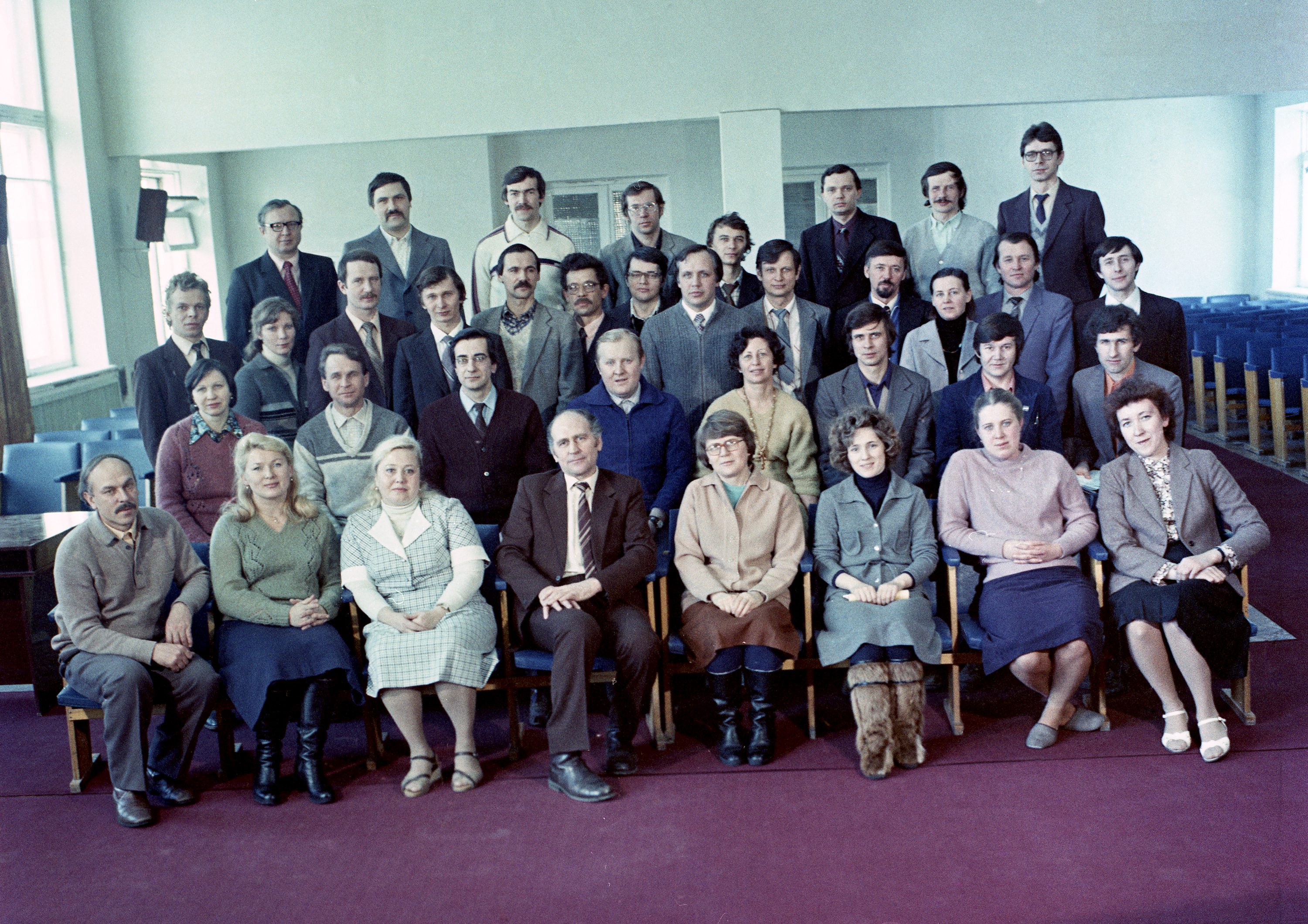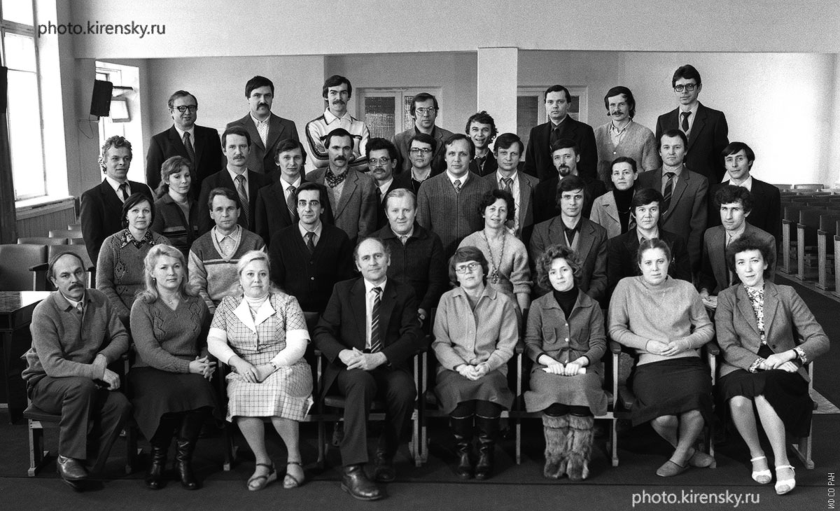 Сотрудники лаборатории радио-спектроскопического структурного анализа Института физики им. Л.В. Киренского Сибирского отделения Академии наук СССР. В первом ряду сидят (слева направо): Трофимов В.И., Абакумова В.С., Кочарова А.Г., Зеер Э.П., Фалалеева Л.Г., Подмаркова А.Б., Изосимова М.Г., Черных А.В.. Во втором ряду (слева направо): Могилевцева Г.А., Серебрянников В.Л., Лившиц А.И., Кухлевский О.П., Петраковская Э.А., Иванов Ю.Н., Меньшиков В.В., Зобов В.Е.. В третьем ряду (слева направо): Пустынский А.В., Лупинина С.Э., Лисин В.В., Трофимов С.А, Черкасов Б.И., Лыбзиков Г.Ф., Зайцев В.Г., Попов М.А., Бузник В.М.,Кубарев Ю.Г., Виноградова И.С., Афанасьев М.Л., Иомин Л.М., В четвертом ряду (слева направо): Фалалеев О.В., Русских А.В., Поляков А.М., Прозоров С.П., Мацулев А.Н., Елизарьев Ю.Г.,