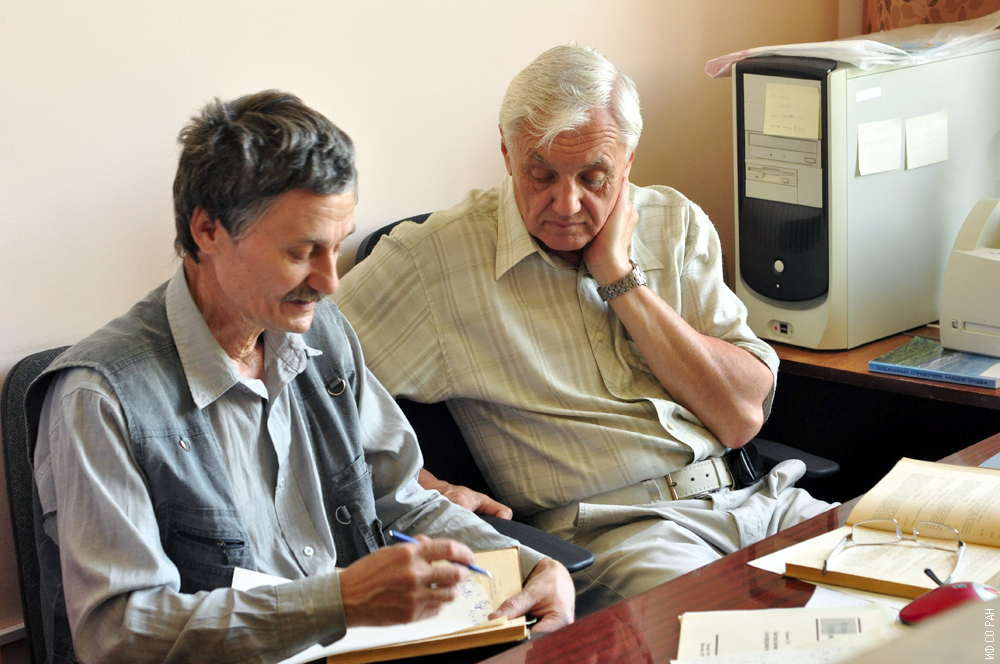 Мартынов Сергей Николаевич (слева), старший научный сотрудник лаборатории резонансных свойств магнитоупорядоченных веществ и Панкрац Анатолий Иванович, заведующий лабораторией резонансных свойств магнитоупорядоченных веществ Института физики им. Л.В. Киренского Сибирского отделения Российской академии наук (ИФ СО РАН), за обсуждением результатов эксперимента. Фото 2008 года. Красноярск