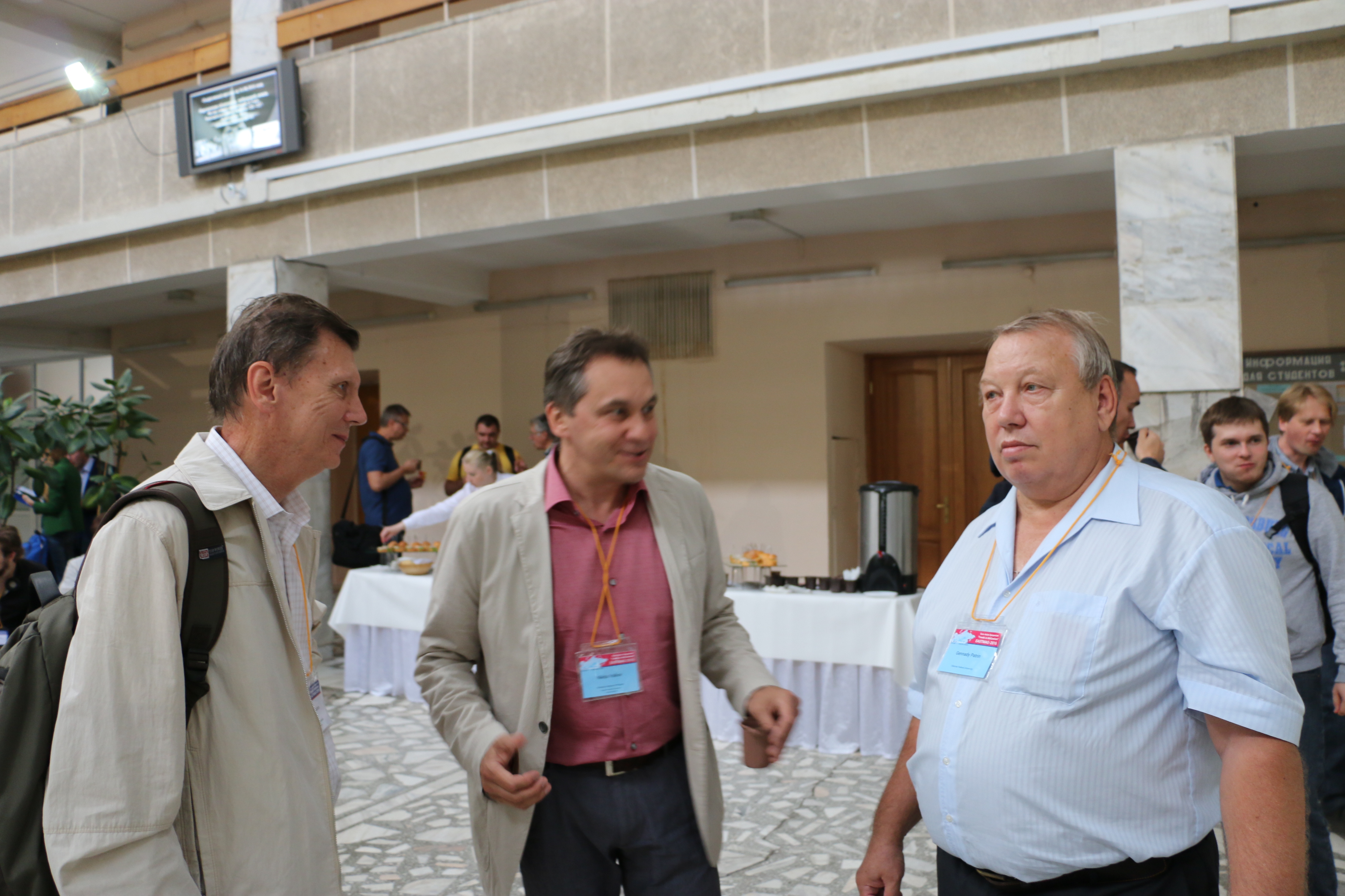 15 августа 2016 года. На открытии Евро-Азиатского симпозиума "Прогресс в магнетизме" (EASTMAG-2016) в конгресс-холле Сибирского федерального университета (СФУ) Красноярска. Слева направо:Турпанов И.А., Горнаков В.С., Патрин Г.С., заведующий лабораторией магнитодинамики Института физики им. Л.В. Киренского Сибирского отделения Российской академии наук (ИФ СО РАН), председатель локального Организационного комитета симпозиума.