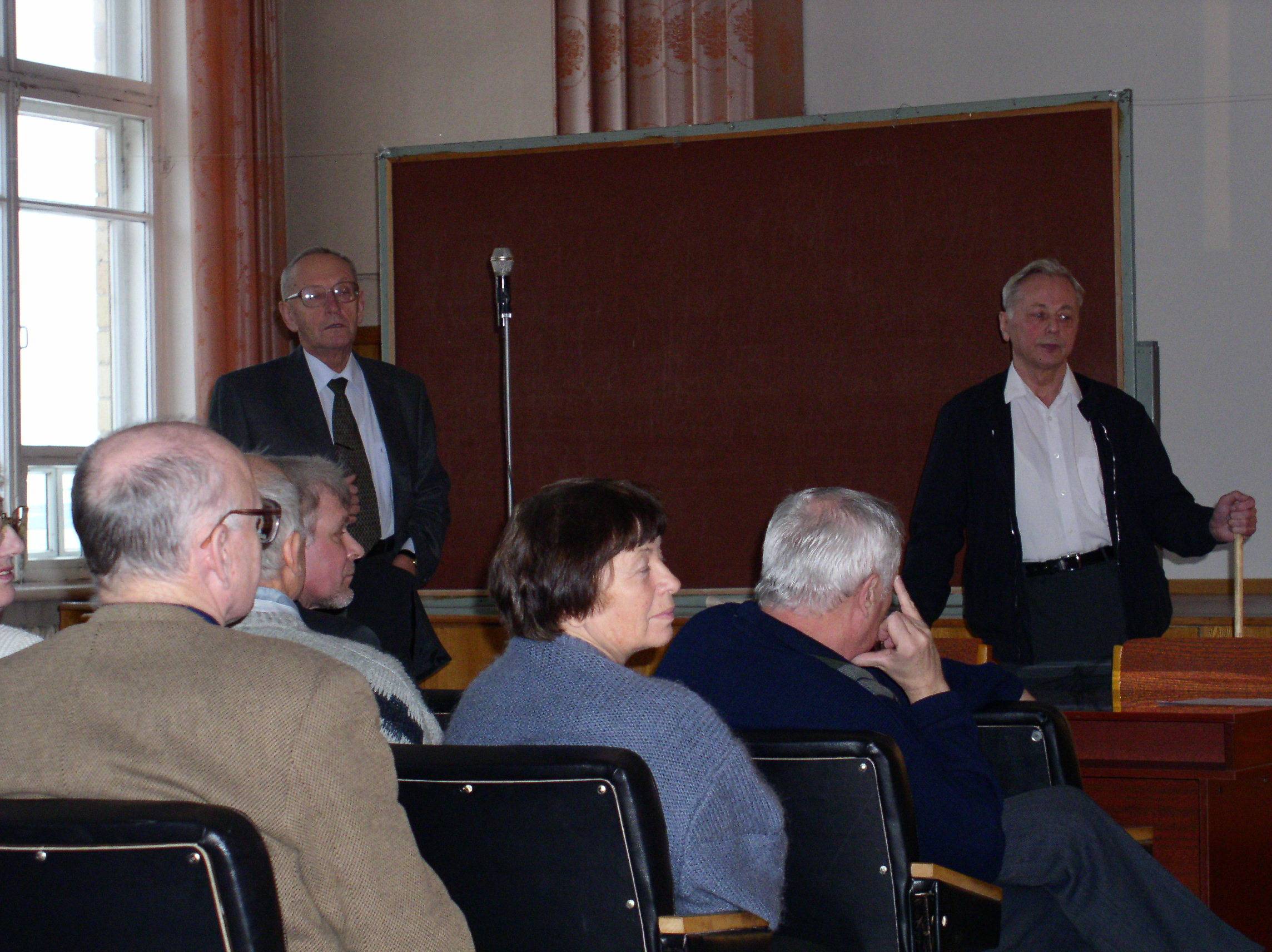 Общеинститутский физический семинар в конференц-зале Института физики им. Л.В. Киренского Сибирского отделения Российской академии наук (ИФ СО РАН). У доски академик Александров К.С. (слева), директор института и Петраковский Г.А.,