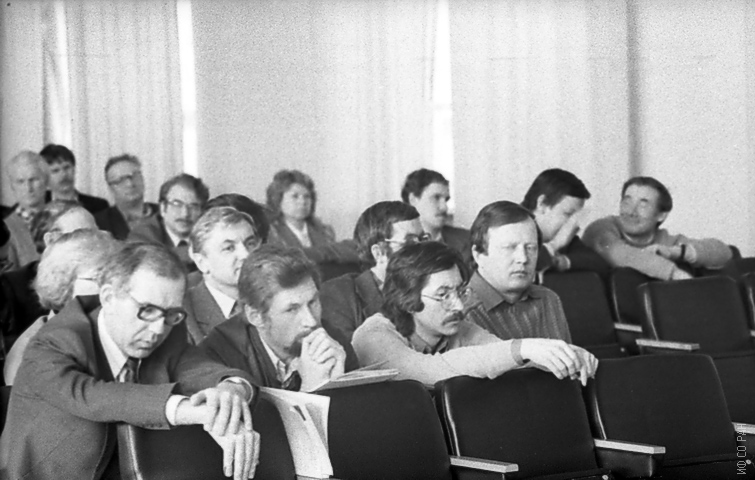Общеинститутский физический семинар в Институте физики им. Л.В. Киренского Сибирского отделения Академии наук СССР (ИФ СО АН СССР). В первом ряду, слева направо: Овчинников С.Г., Сандалов И., ?, Вальков В.В. Во втором ряду: Панкрац А.И. (второй слева), крайний - Пономарев В.И. В третьем ряду Фролов Г.И., Полякова К.П, далее: Мальцев В.К. Лукиных В.Ф., Бондаренко Г. В., фото 1984 года. Красноярск.