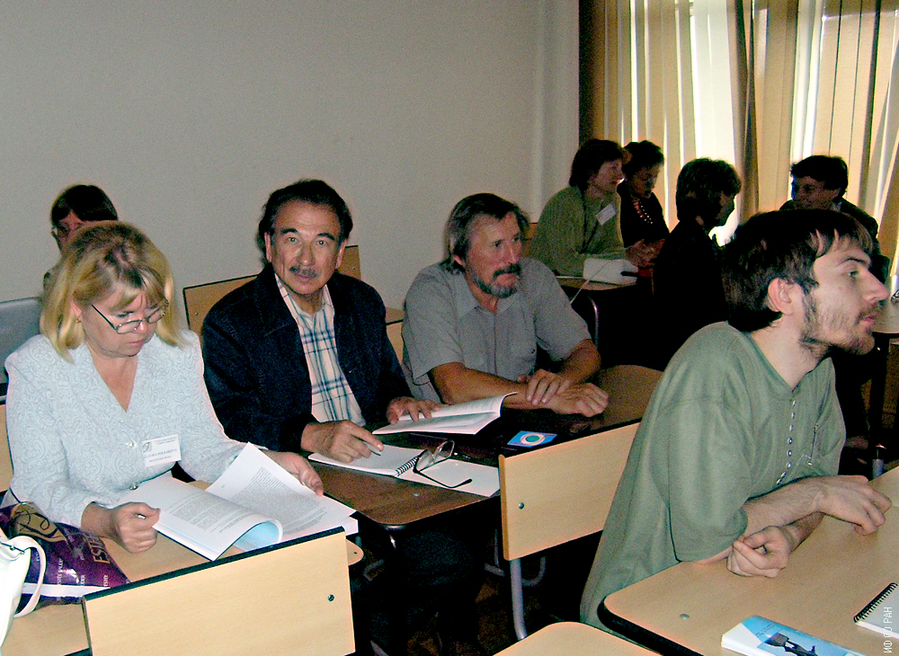 Рабочий момент на Евро-Азиатском симпозиуме «Прогресс в магнетизме» (ЕASTMAG-2004). Заседание секции «Микрокристаллические, аморфные и пористые слои. Новые приборные структуры на основе объемного материала и наноструктур». Сотрудники Института физики им. Л.В. Киренского Сибирского отделения Российской академии наук (ИФ СО РАН). Во втором ряду слева направо: Клавдия Павловна Полякова, Георгий Иванович Фролов, Виктор Степанович Жигалов, Красноярск, август 2004 год.