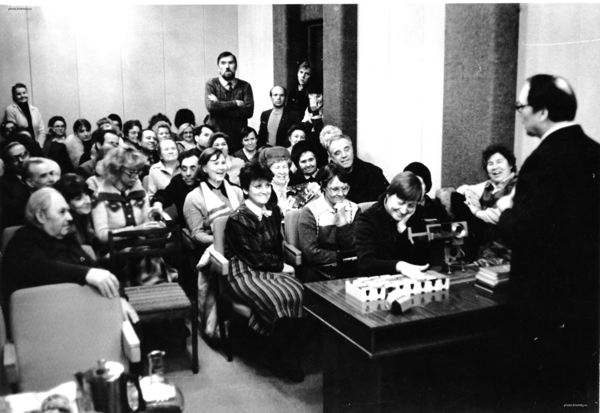 Много лет в конференц-зале Института физики им. Л.В. Киренского Сибирского отделения Академии наук СССР (СО АН СССР) проходили встречи с писателями, композиторами, певцами не только Красноярска и диспуты были неотъемлемой частью жизни сотрудников. Все мероприятия собирали полный зал. В этом зале пел Борис Тимофеевич Штоколов, выступал молодой, начинающий карьеру Владимир Теодорович Спиваков с группой единомышленников, а встречи с Виктором Петровичем Астафьевым были почти регулярны. Он с удовольствием встречался с сотрудниками Института физики и жителями Академгородка, поскольку жил в Академгородке. На снимке: встреча с Виктором Петровичем в библиотеке Института биофизики СО АН СССР в 1987 году. Речь шла о вышедших в 1987 году рассказах, которые вошли в третью книгу «Последний поклон». На снимке за столом, инициатор встречи, сотрудник Института биофизики Владислав Викторович Спиров. В первом ряду крайняя справа Галина Алимовна Шугинина, заведующая библиотекой Института физики. Во втором ряду, слева направо: Эмма Константиновна Родичева – Институт биофизики; Мария Семёновна Корякина - супруга Астафьева; родственница Астафьевых и далее Виктор Петрович. Позади Родичевой Иосиф Исаевич Гительзон. Стоят в конце комнаты – Николай Сергеевич Чистяков (со сложенными руками), ученый секретарь Красноярского научного центра и Николай Сергеевич Абросов.