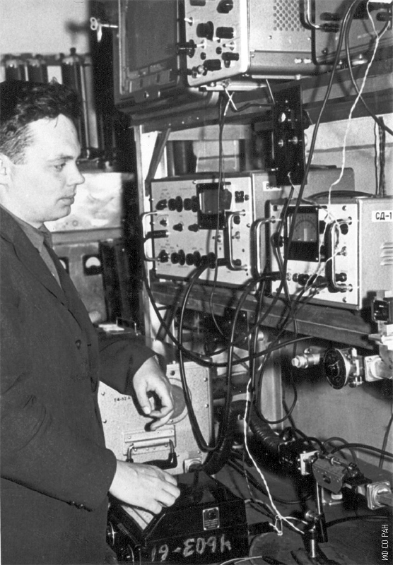 Тушков Б. П. (слева) и Русов Г. И. за работой на установке, разработанной и созданной Тушковым Б.П. в 1966 году в лаборатории физики магнитных явлений Института физики Сибирского отделения Академии наук СССР (заведующий лабораторией Л. В. Киренский). Установка позволяла проводить измерения составляющих комплексной СВЧ восприимчивости.