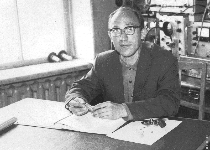 1962 год. Рябинкин Лев Николаевич, сотрудник лаборатории кристаллофизики (до 1964 года) Института физики Сибирского отделения Академии наук СССР (ИФ СО АН СССР), у созданной им уникальной установки для измерения скорости ультразвука в малых кристаллических образцах. В то время точность измерения составляла 0,02 % на образцах размером около 3 мм. Красноярск.