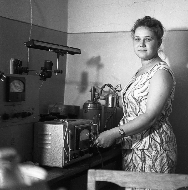 1964 год. На снимке Л.И. Рябинкина, младший научный сотрудник лаборатории магнитных материалов Института физики Сибирского отделения Академии наук СССР (ИФ СО АН СССР), за установкой по измерению электросопротивления ферритов мостовым компенсационным методом. Красноярск.