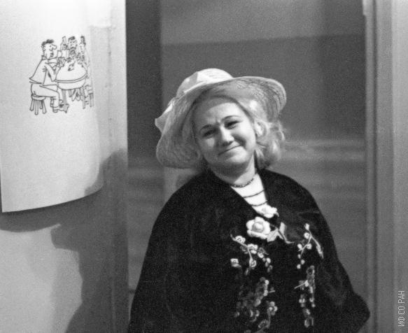 1974 год. Рябинкина Людмила Ивановна, сотрудник Института физики им. Л.В. Киренского Сибирского отделения Академии наук СССР (ИФ СО АН СССР ), на занятиях в группе по ускоренному изучению английского языка (кафедра иностранных языков института). На занятиях иногда устраивались театрализованные представления. Людмила Ивановна на одном из таких занятий. Красноярск.