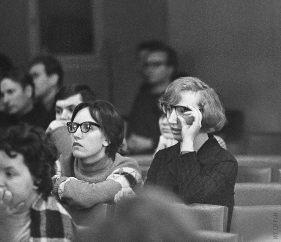 Протопопова Л.М. (слева) и Саблина К.А., сотрудники лаборатории резонансных свойств магнитоупорядоченных веществ Института физики им. Л.В. Киренского Сибирского отделения Академии наук СССР (ИФ СО АН СССР), на семинаре лаборатории в конференц-зале института. Снимок 1974 года. Красноярск.