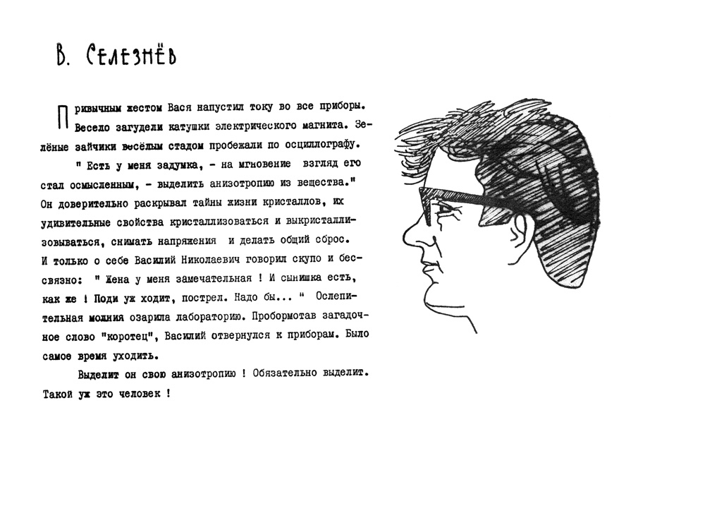 Дружеский шарж Селезнева В.Н. из книги шаржей и эпиграмм"Музей друзей", первая часть которой вышла в 1967 году. Авторами ее являются научные сотрудники института О.А. Баюков и Н.С. Чистяков. Книга вышла малым тиражом (всего 100 экземпляров) и моментально разошлась среди персонажей книги, сотрудников и была подарком авторов к юбилею института.