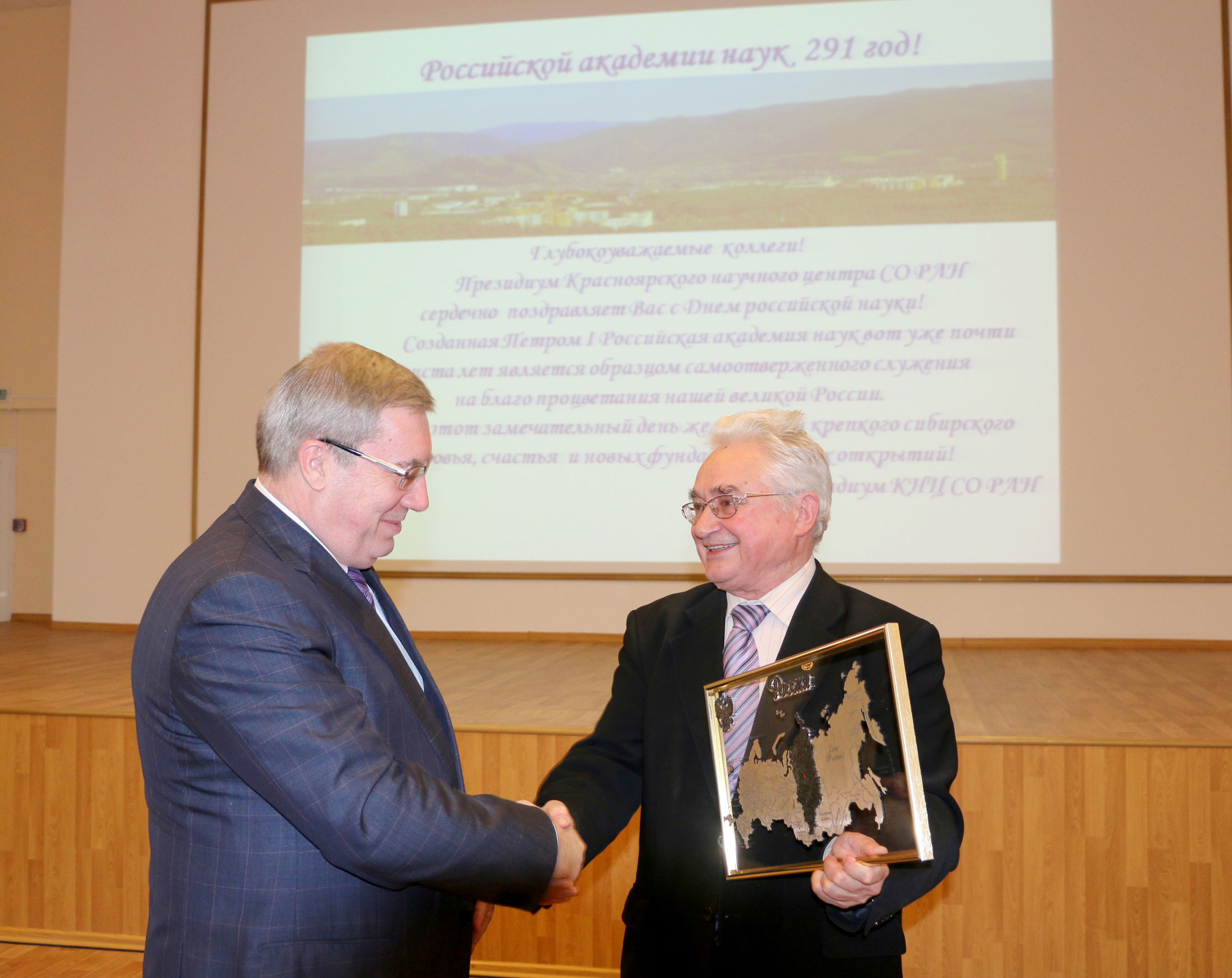 Российской академии наук 291 год. Карту Российской Федерации, изготовленную путем лазерной резки, академику В.Ф. Шабанову (справа), председателю Президиума Красноярского научного центра Сибирского отделения Российской академии наук (КНЦ СО РАН), вручает Губернатор Красноярского края Толоконский В.А. 2015 год. Красноярск.