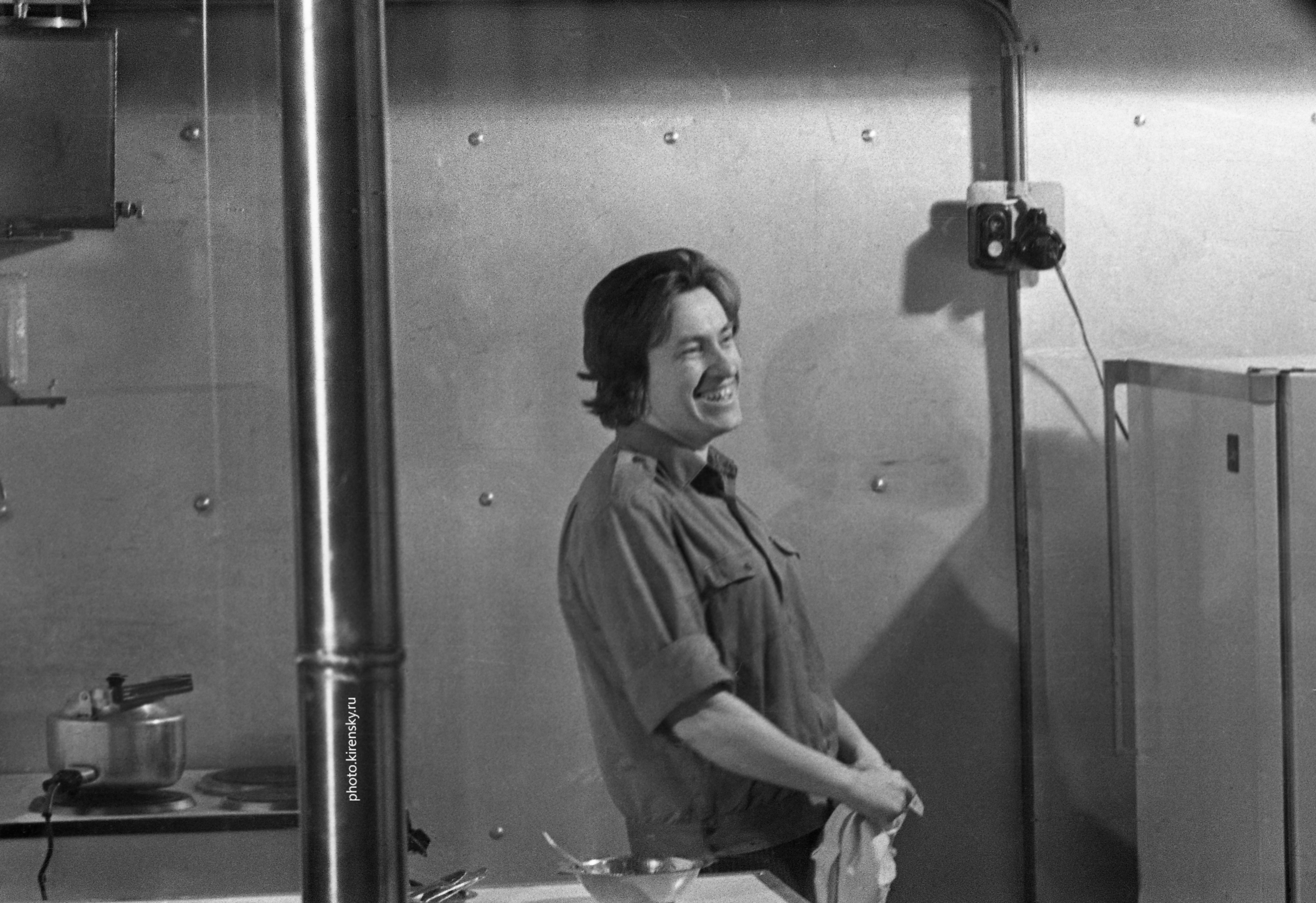 В 1967- 1971 годах в Институте физики им. Л.В. Киренского Сибирского отделения Академии наук СССР (ИФ СО АН СССР) проводились разработка, конструирование и изготовление (точнее сказать строительство) нового для того времени уникального экспериментального комплекса "Биос-3". Л.В. Киренский оказал решающее влияние на подготовку и выполнение в сжатые сроки этой огромной работы. Комплекс предназначался для решения задач, направленных на воспроизводство пищи в замкнутой биологической системе жизнеобеспечения. "БИОС-3" представлял собой гермокамеру, разделенную на три отсека. На фото - кухонный отсек установки, снабженный всем необходимым оборудованием для длительной жизни трех испытателей. Слева направо - участники 6-ти месячного эксперимента в «БИОС-3»: М.П. Шиленко, В.В. Терских, Н.И. Петров, фото 1973 года.
