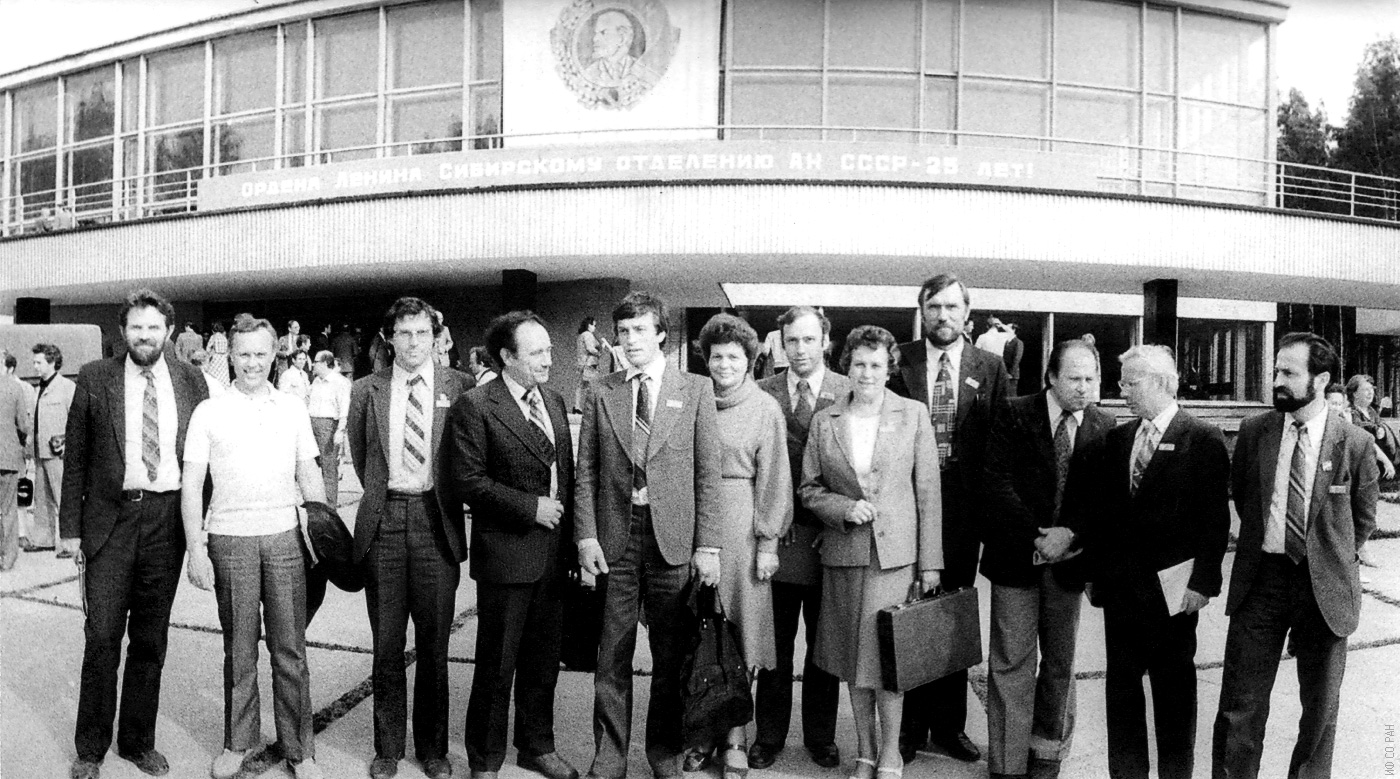 1982 год. Фото на память в дни празднования 25-летия Сибирского отделения Академии наук СССР (СО АН СССР). Делегация Красноярского научного центра СО АН СССР, слева направо: Холькин А.И., Хрусталев Б.П., Бабанин В.Б., ?,?,Соколова (Александрова) В.А., Цветков П.А., Харченко Г.Г., Чистяков Н.С., Габуда С.П., Сидько Ф.Я., Фиш А.М., Новосибирск, Академгородок. .