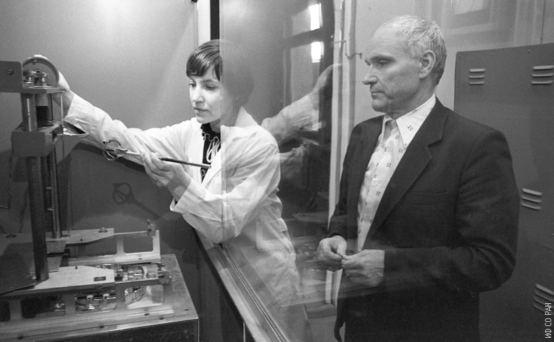 Соколова Н. А., младший научный сотрудник лаборатории магнитных материалов и Безматерных Л. Н., заведующий лабораторией магнитных материалов Института физики им. Л.В. Киренского Сибирского отделения Академии наук СССР (ИФ СО АН СССР). Фото 1983 года. Красноярск.