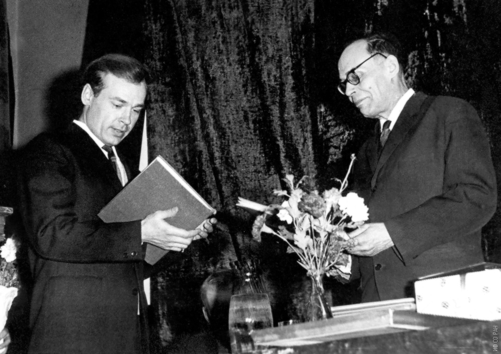 Спиридонов В.П., старший научный сотрудник лаборатории молекулярной спектроскопии Института физики им. Л.В. Киренского Сибирского отделения Академии наук СССР (ИФ СО АН СССР), поздравляет своего учителя, профессора Коршунова А.В., с 60-летним юбилеем, фото 1971 года. Красноярск.