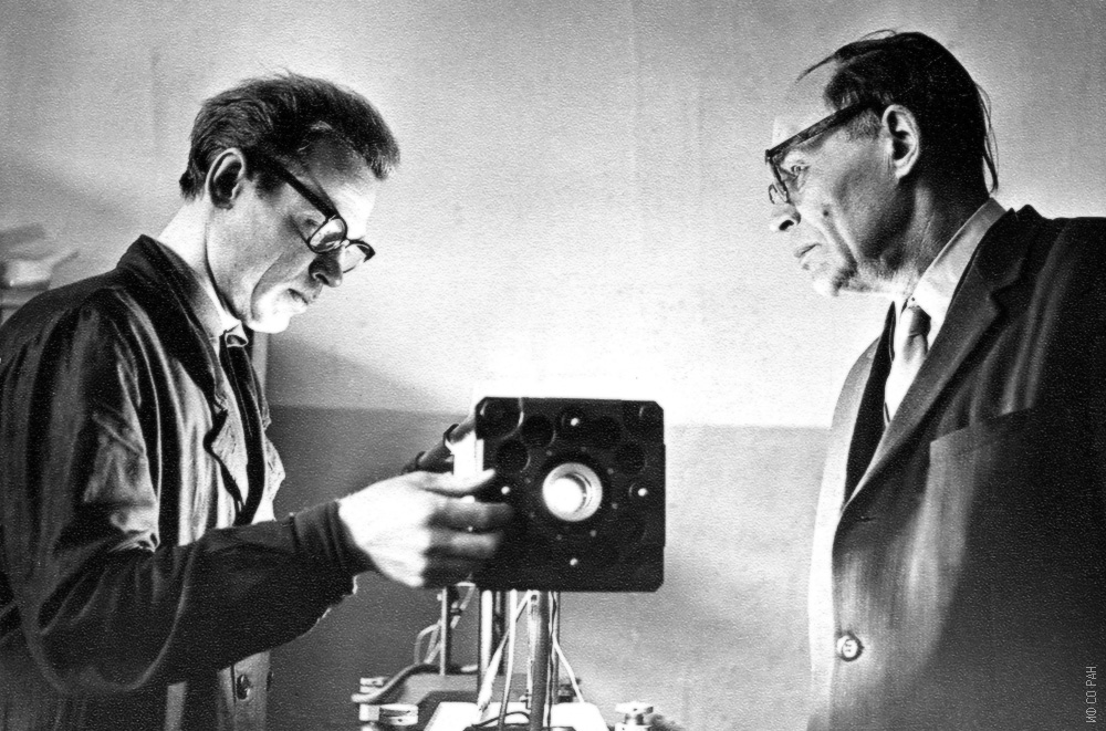 1973 год. Учитель и ученик. А.В. Коршунов, заведующий лабораторией молекулярной спектроскопии Института физики им. Л.В. Киренского СО РАН (справа), и аспирант Спиридонов В. П. у созданного в лаборатории мощного лазера, необходимого для получения спектров комбинационного рассеяния света молекулярных кристаллов.