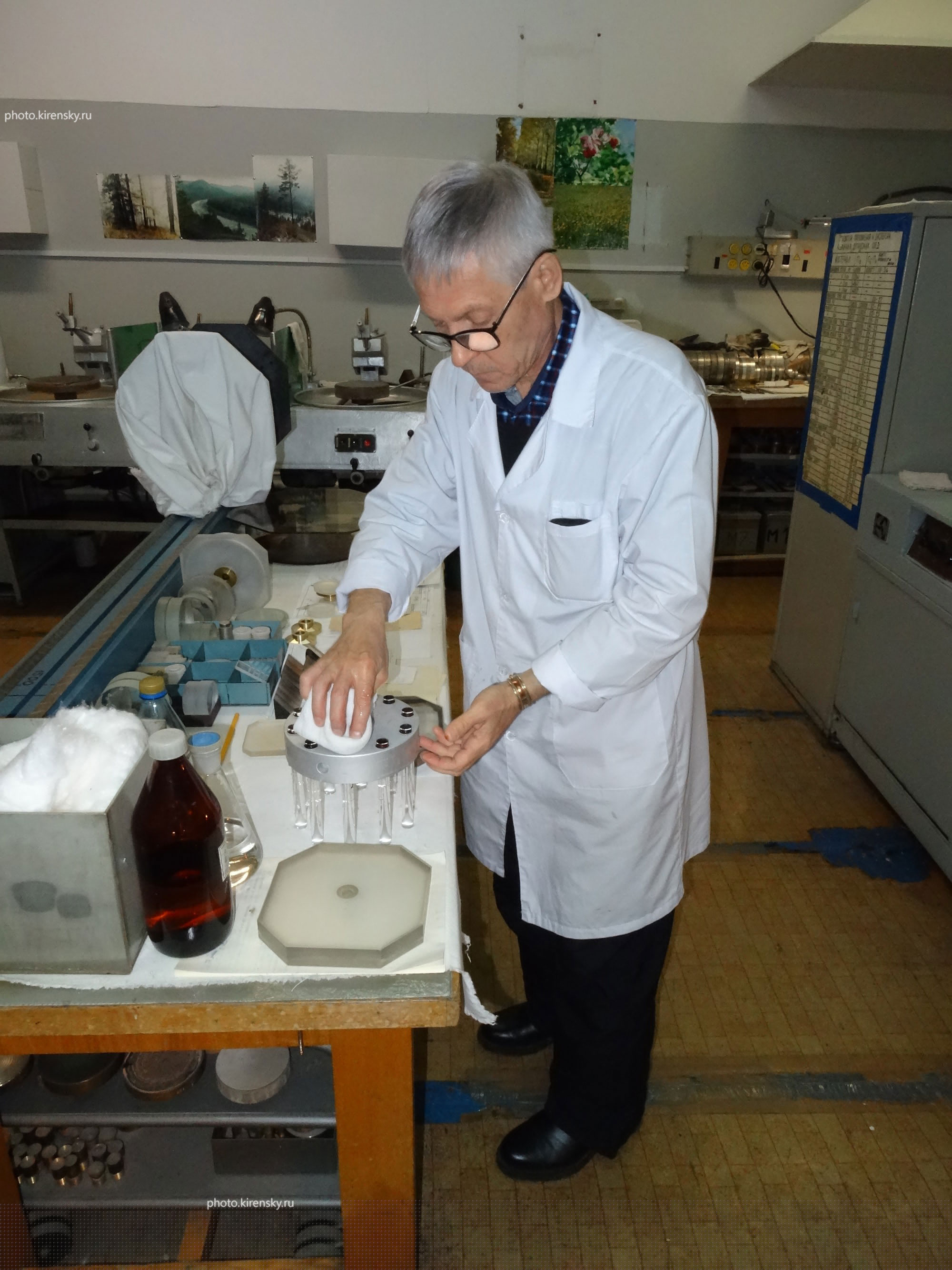 2019 год. Свентитский Владимир Михайлович, сотрудник Института физики им. Л.В. Киренского Сибирского отделения Российской академии наук ( ИФ СО РАН), занят полировкой оптических стекол, предназначенных для использования в экспериментальной лазерной установке лаборатории Научного приборостроения.