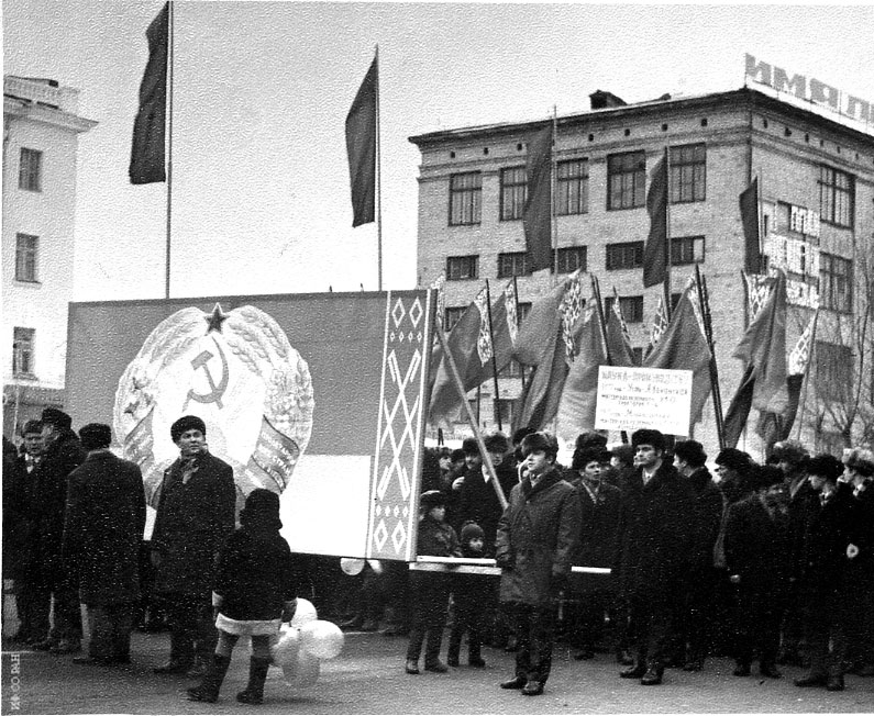 7 ноября 1975 года. Колонна Института физики им. Л.В. Киренского Сибирского отделения Академии наук СССР на демонстрации, посвященной Октябрьской революции 1917 года. Во главе колонны директор института И.А. Терсков, член-корреспондент Академии наук СССР. Красноярск.