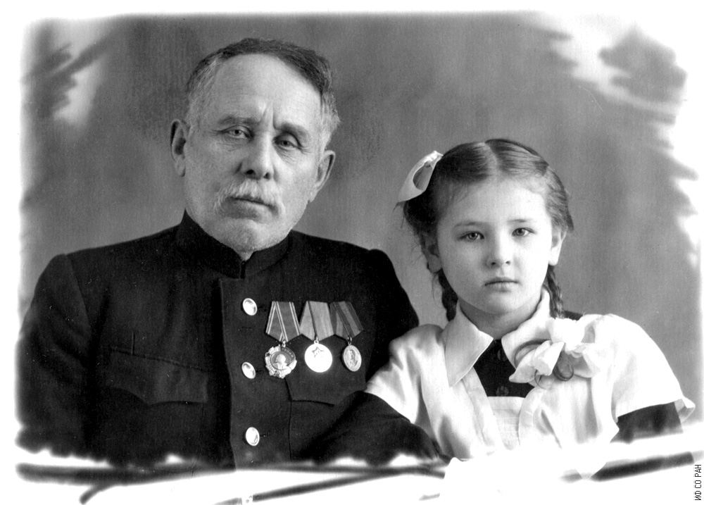 Терсков Александр Николаевич, отец академика И.А.Терского, директора Института физики им. Л.В. Киренского Сибирского отделения Академии наук СССР (1969-1981 гг.), с внучкой Машей (дочерью Терского). Снимок 1954 года. Красноярск.