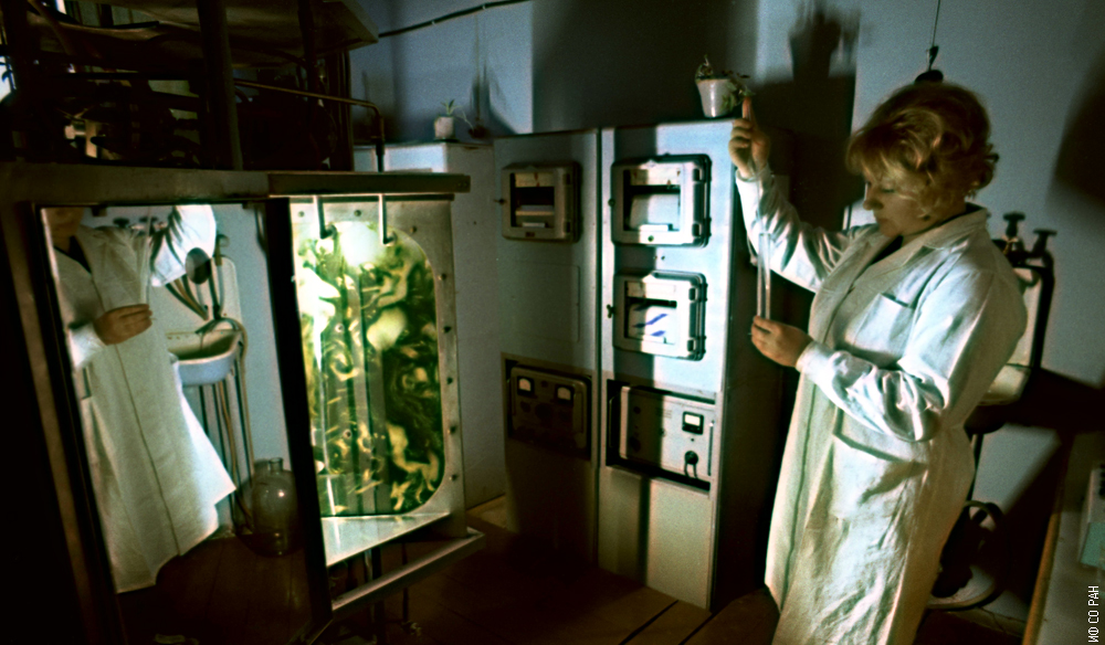 Толкач Валентина Викторовна, старший лаборант в лаборатории управляемого биосинтеза Института физики им. Л.В. Киренского Сибирского отделения Академии наук СССР (ИФ СО АН СССР), около одного из культиваторов по выращиванию хлореллы, 1972 год. Красноярск.