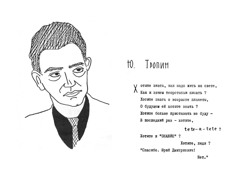 Дружеский шарж Тропина Ю. Д. из книги "Музей друзей", изданной научными сотрудниками Института физики Сибирского отделения Академии наук СССР Олегом Артемьевичем Баюковым и Николаем Сергеевичем Чистяковым. Удивительная книжка дружеских шаржей и эпиграмм на сотрудников. Она вышла в 1967 году к 10-летию начала работы института. Вышла небольшим тиражом в 100 экземпляров и распространялась строго по списку, лично в руки. Узнать себя на страницах книги смогли 48 самых ярких и заметных личностей молодого института. Позже (в 1971 году) вышла вторая книга под таким же названием. Что побудило их взяться за такой труд, авторы подробно изложили в предисловии к первой и второй книгам. Книги размещены на сайте. Красноярск.