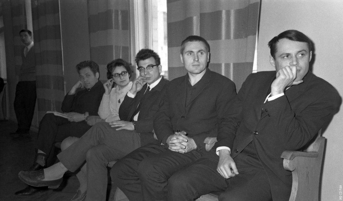 В конференц-зале Института физики Сибирского отделения Академии наук СССР, слева направо: Смокотин Э. М. (стоит у окна), Успенский А. С., Саланская Л. А., Фролов Г. И., Логутко А. Л., Талашкевич И. П., фото 1970 года. Красноярск.