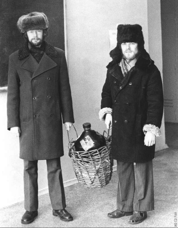 Рабочий момент. Сотрудники лаборатория физики магнитных пленок Института физики им. Л.В. Киренского Сибирского отделения Академии наук СССР Вершинин В.В. (слева) и Беляев Б.А. пополняют запасы химических реактивов лаборатории. Фото 1981 года. Красноярск.