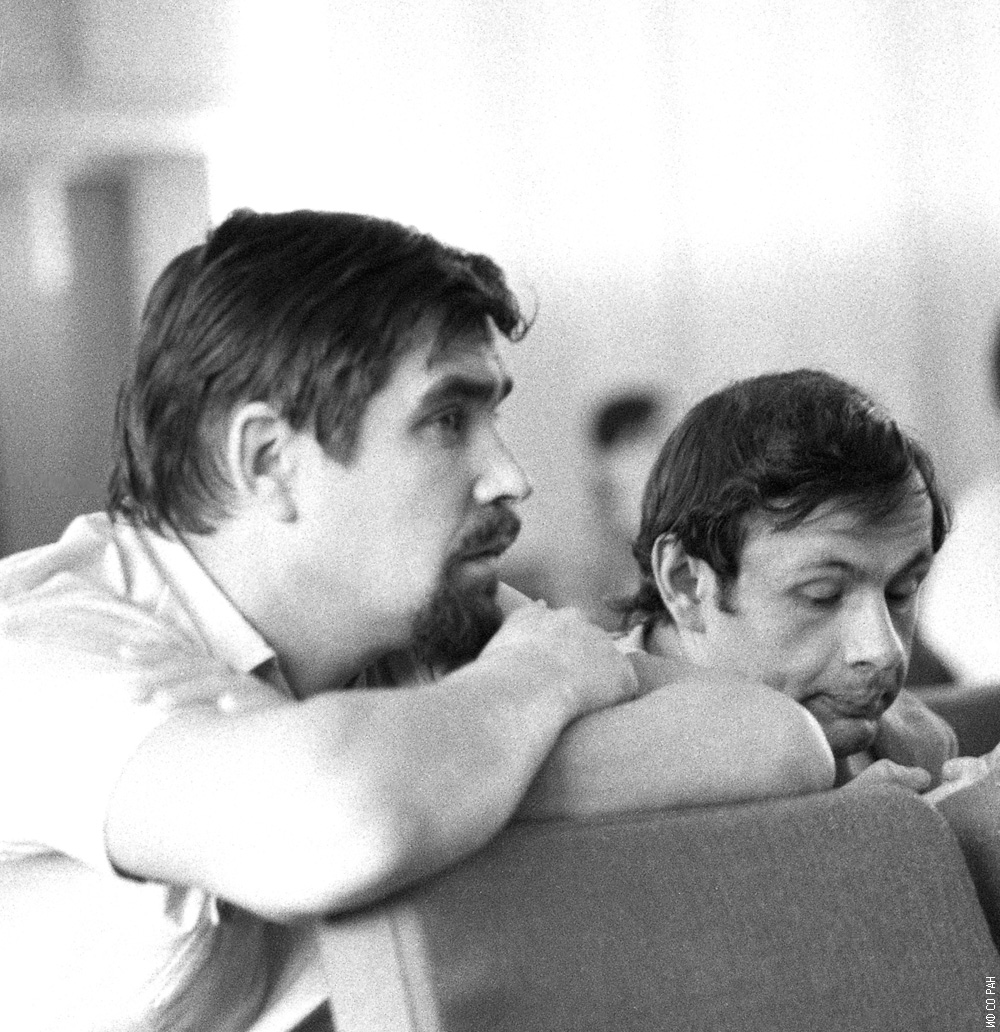 1986 год. Владимиров А. Г. (слева) и Красиков В.С., сотрудники Института физики им. Л.В. Киренского Сибирского отделения Академии наук СССР (ИФ СО АН СССР), на семинаре по функциональной магнетоэлектронике, организованном и проведенном Институтом физики в г. Дивногорске (Красноярский край).