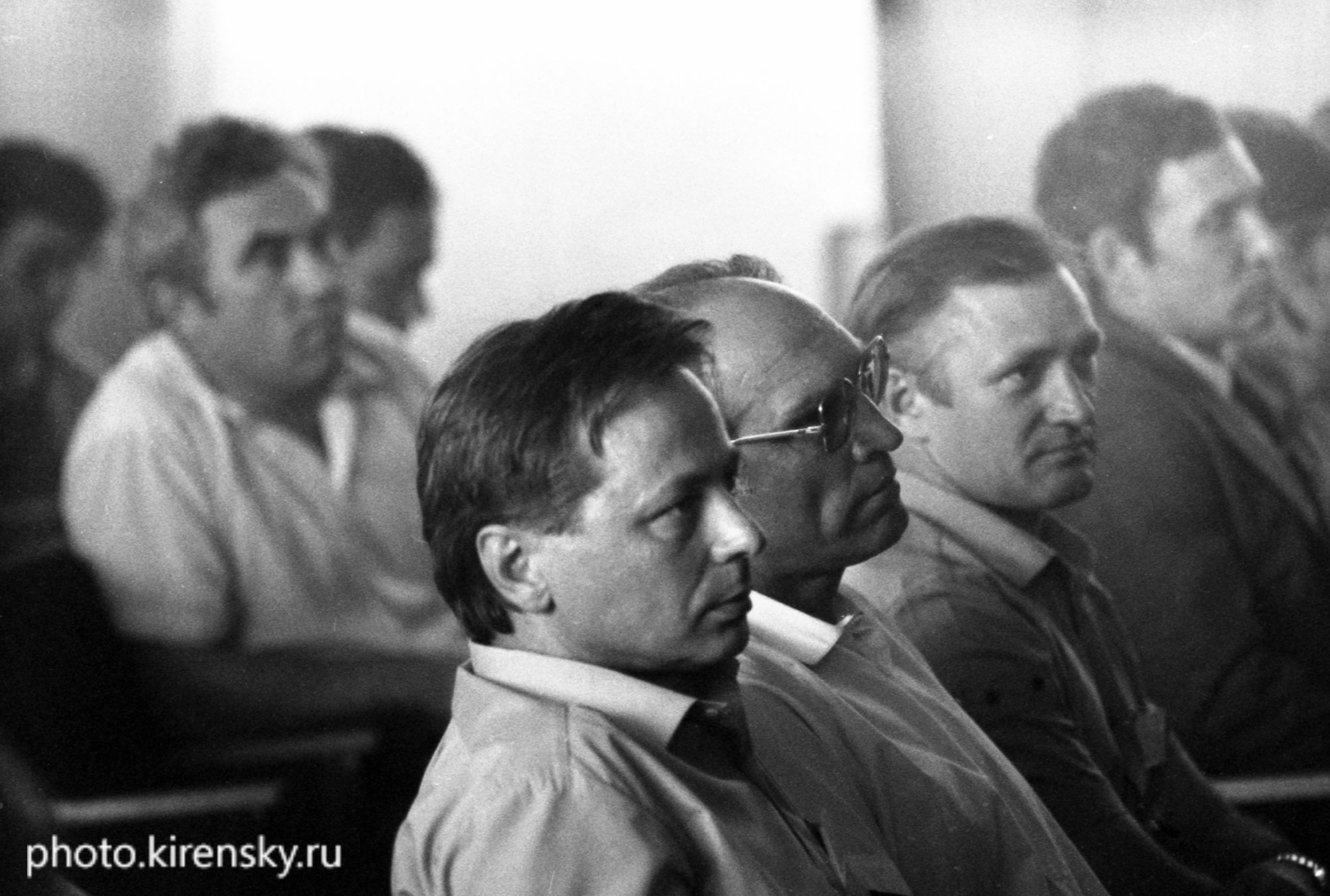 1980 год. В конференц-зале сотрудники лаборатории радиоспектроскопического структурного анализа Института физики им. Л.В. Киренского Сибирского отделения Академии наук СССР (ИФ СО АН СССР) на общеинститутском физическом семинаре: Москвич Ю.Н. (в центре), справа от него Попов М. А. Сидит (в центре) Владимиров В.М. Красноярск.