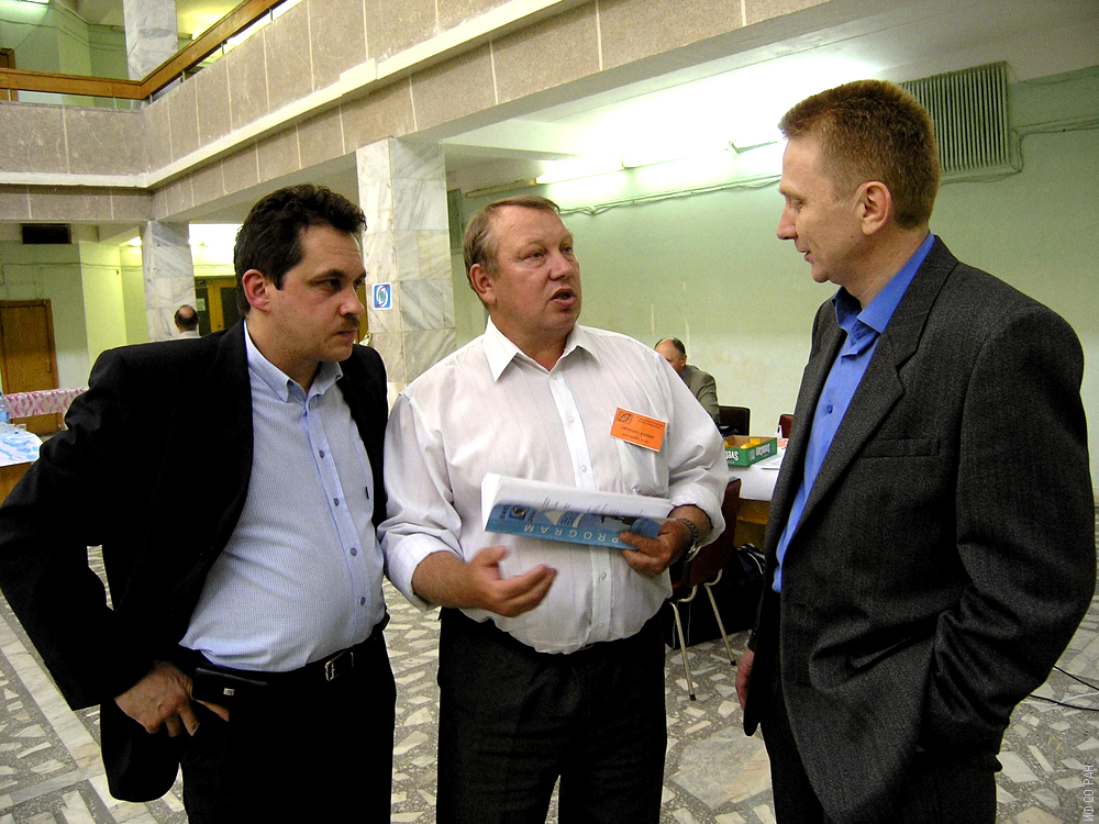 Слева направо: Ша Валлоппилли, профессор технического университета Мюнхена, и сотрудники Института физики им. Л.В. Киренского Сибирского отделения Российской академии наук (ИФ СО РАН) Волков Никита Валентиновичи и Петраковский Герман Антонович на Международном семинаре NATO Workshop "Smart Materials for Ranging Systems (Современные материалы для применения в качестве датчиков)". Красноярск, август 2004 года.