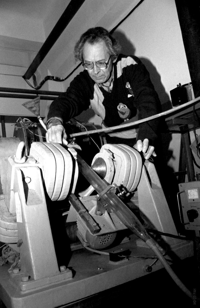 Якубайлик Эдуард Константинович, старший научный сотрудник лаборатории сильных магнитных полей Института физики им. Л.В. Киренского Сибирского отделения Российской академии наук (ИФ СО РАН), специалист по магнитной сепарации минералов, за установкой лабораторного магнитного сепаратора для обогащения руд, фото 1990 года. Красноярск.