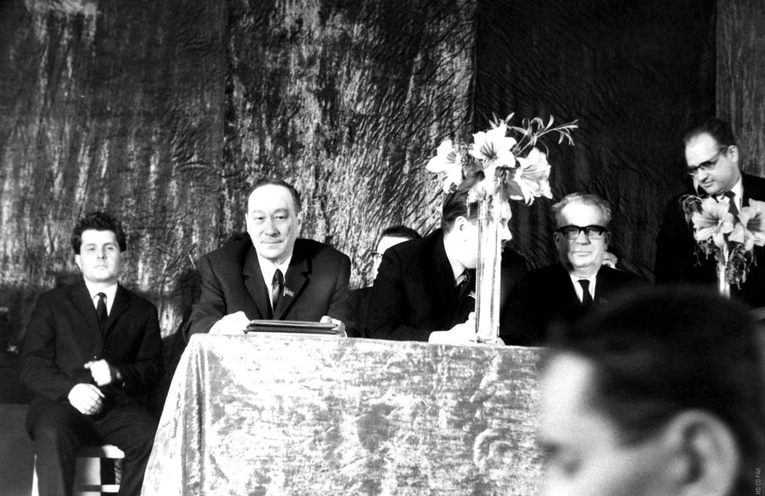 7 апреля 1969 года академика Л.В. Киренского (справа), организатора и первого директора Института физики Сибирского отделения Академии наук СССР (ИФ СО АН СССР) с 60-летним юбилеем поздравляет ректор Красноярского государственного университета А. И. Дрокин, на втором плане - Ю.В. Захаров