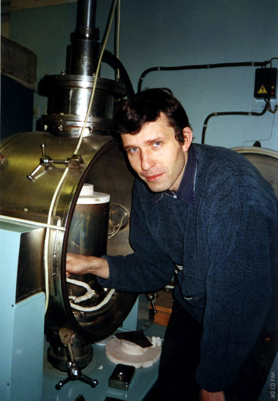 Зайцев А.И., старший научный сотрудник лаборатории кристаллофизики Института физики им. Л.В. Киренского Сибирского отделения Российской академии наук, за подготовкой печи для роста кристаллов, фото 2001 года. Красноярск.