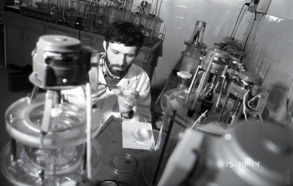 Зайцев Александр Иванович, младший научный сотрудник лаборатории кристаллофизики Института физики Сибирского отделения Академии наук СССР (ИФ СО АН СССР), за установкой для роста кристаллов из водных растворов методом изотермического испарения растворителя. Снимок 1990 года. Красноярск.
