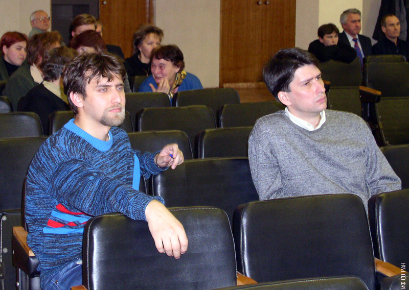 В конференц-зале Института физики им. Л.В. Киренского Сибирского отделения Российской академии наук (ИФ СО РАН). На переднем плане: Комогорцев Сергей Викторович (слева), старший научный сотрудник лаборатории физики магнитных пленок и Жарков Сергей Михайлович, старший научный сотрудник лаборатории когерентной оптики. Снимок 2005 года. Красноярск.