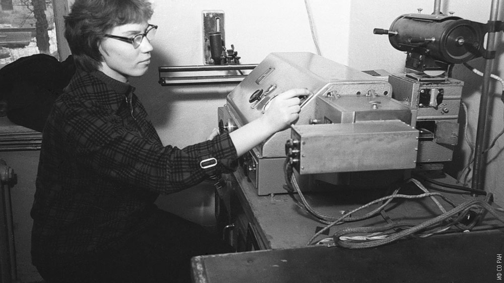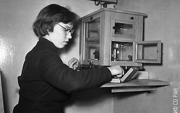 Звегинцева Лариса Николаевна, сотрудник лаборатории молекулярной спектроскопии Института физики Сибирского отделения Академии наук СССР (ИФ СО АН СССР), за работой на спектрофотометре, фото 1964 года.