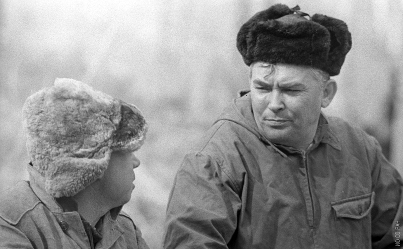 Терсков И.А., член-корреспондент Академии наук СССР, заместитель директора по научной работе Института физики Сибирского отделения Академии наук СССР (справа), был заядлым охотником и рыболовом. На этом фото он вместе с Зыряновым Г.И, сотрудником лаборатории магнитных материалов института, в охотничьих угодьях. Снимок 1963 года.