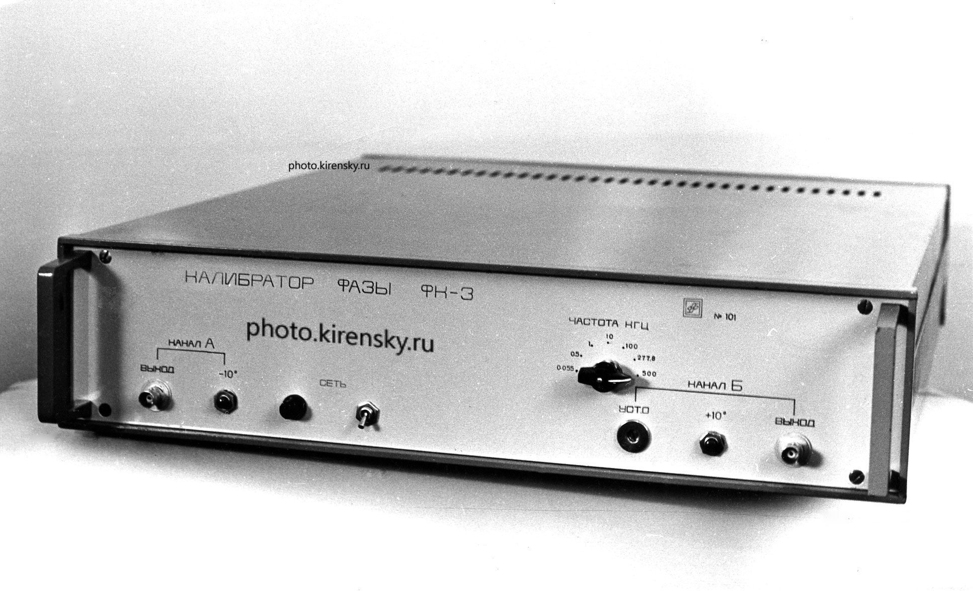 Калибратор фазы ФК-3 предназначался для проверки по основной погрешности всех серийно выпускаемых и разрабатываемых фазометров в диапазоне частот 50 Гц- 500кГц. Прибор разработан в лаборатории приборостроения и изготовлен в экспериментальных механических мастерских Института физики им. Л.В. Киренского СО АН СССР в 1974 году. Авторы: С.С. Кузнецкий, Н.М. Курочкина, Л.Е. Быкова, Ю.М. Тихомиров, В.Д. Раков. Красноярск