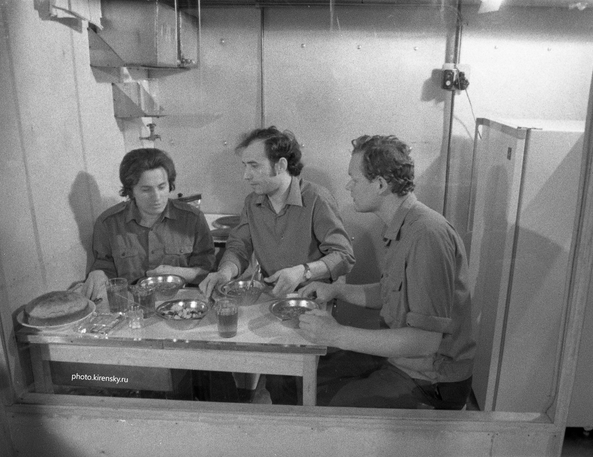 В 1967- 1971 годах в Институте физики им. Л.В. Киренского Сибирского отделения Академии наук СССР (ИФ СО АН СССР) проводились разработка, конструирование и изготовление (точнее сказать строительство) нового для того времени уникального экспериментального комплекса "Биос-3". Л.В. Киренский оказал решающее влияние на подготовку и выполнение в сжатые сроки этой огромной работы. Комплекс предназначался для решения задач, направленных на воспроизводство пищи в замкнутой биологической системе жизнеобеспечения. "БИОС-3" представлял собой гермокамеру, разделенную на три отсека. На фото - кухонный отсек установки, снабженный всем необходимым оборудованием для длительной жизни трех испытателей. Слева направо - участники 6-ти месячного эксперимента в «БИОС-3»: М.П. Шиленко, В.В. Терских, Н.И. Петров, фото 1973 года.