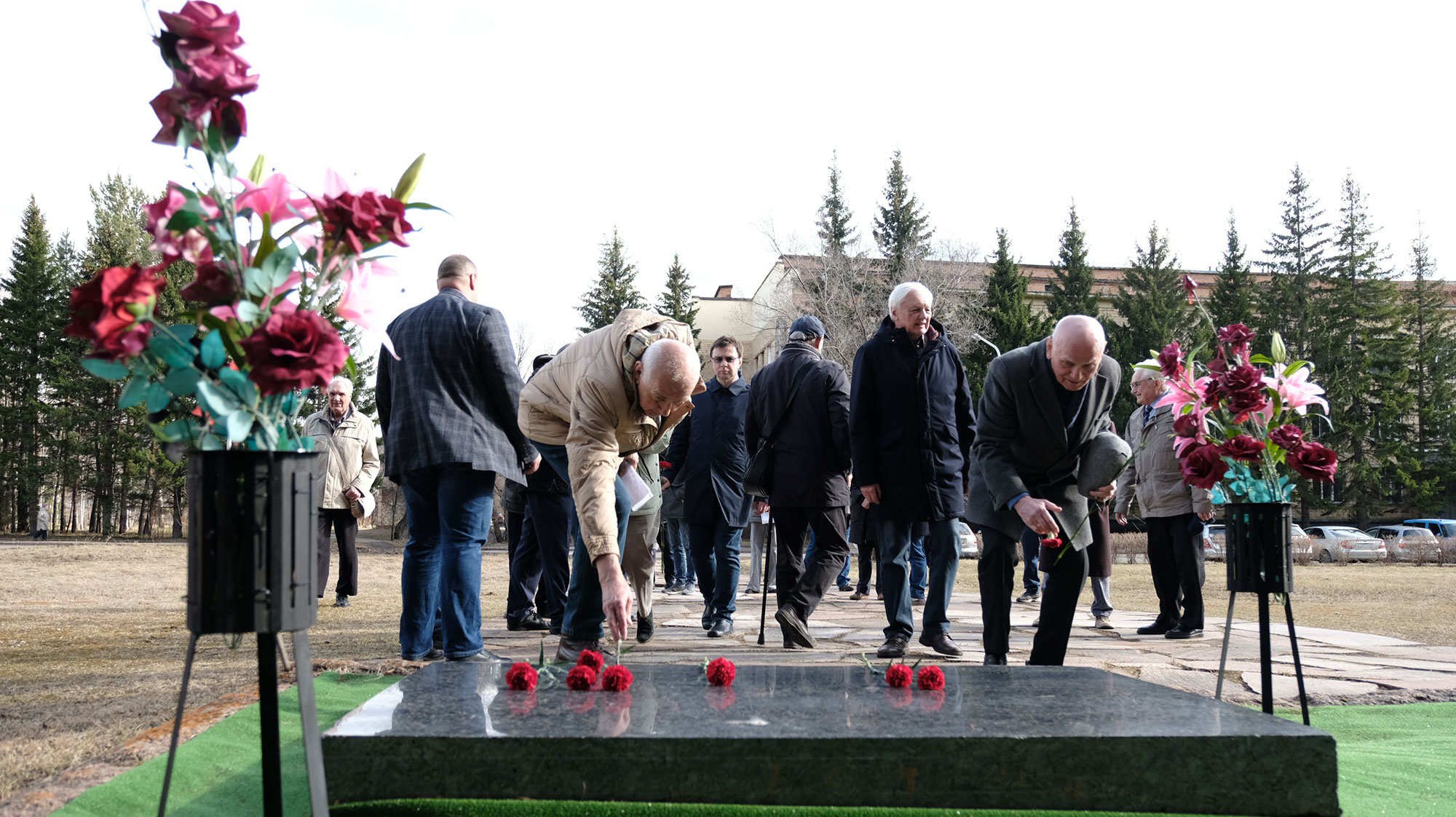 В конференц-зале Института физики им. Л.В. Киренского Сибирского отделения Российской академии наук (ИФ СО РАН) ежегодно в день рождения академика Леонида Васильевича Киренского, организатора и первого директора института проходят научные чтения на расширенном заседание ученого Совета, посвященного его памяти. В 2025 году исполнилось 116 лет со дня рождения академика. По окончанию ученого Совета традиционно возлагаются цветы на могилу Леонида Васильевича. Он похоронен на территории института, носящего его имя в Академгородке Красноярска. На снимке, слева направо: С.Г. Овчинников, заведующий лабораторией физики магнитных явлений, возлагает цветы; М.М. Коршунов, член-корреспондент СО РАН, главный научный сотрудник лаборатории физики магнитных явлений; далее А.И. Панкрац, ведущий научный сотрудник лаборатории резонансных свойств магнитоупорядоченных веществ; И.Н. Флёров, главный научный сотрудник лаборатории кристаллофизики и академик В.Ф. Шабанов. 7 апреля 2025 года.