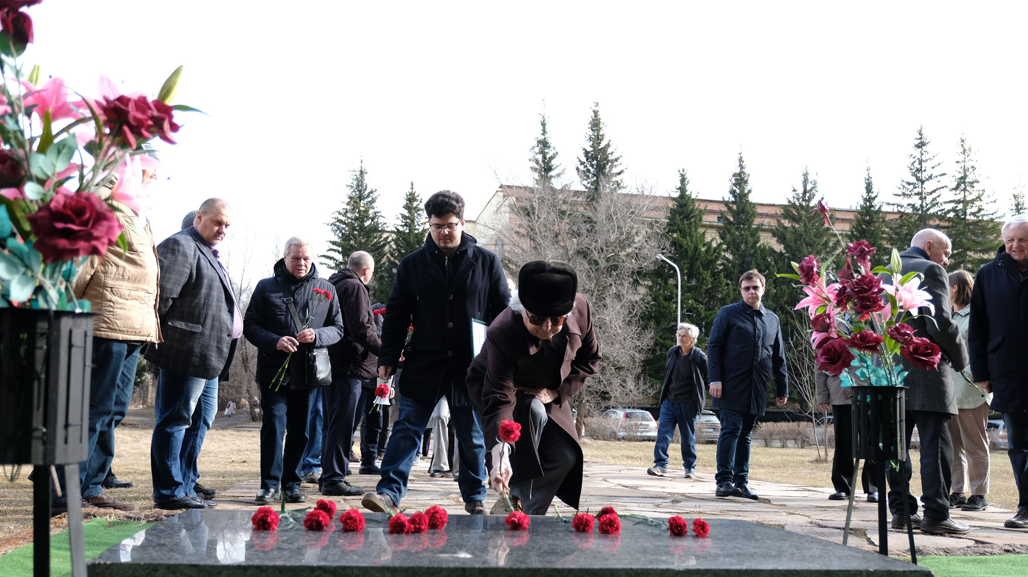 В конференц-зале Института физики им. Л.В. Киренского Сибирского отделения Российской академии наук (ИФ СО РАН) ежегодно в день рождения академика Леонида Васильевича Киренского, организатора и первого директора института проходят научные чтения на расширенном заседание ученого Совета, посвященного его памяти. В 2025 году исполнилось 116 лет со дня рождения академика. По окончанию ученого Совета традиционно возлагаются цветы на могилу Леонида Васильевича. Он похоронен на территории института, носящего его имя в Академгородке Красноярска. На снимке, слева направо: А.Э. Соколов, заместитель директора по научной работе; В.Я. Зырянов, заведующий лабораторией молекулярной спектроскопии; П.Н. Ким, инженер лаборатории фотоники молекулярных систем; В.В. Вальков, главный научный сотрудник лаборатории теоретической физики; С.Н. Мартынов, старший научный сотрудник лаборатории резонансных свойств магнитоупорядоченных веществ; М.М. Коршунов, член-корреспондент СО РАН, главный научный сотрудник лаборатории физики магнитных явлений ИФ. 7 апреля 2025 года.