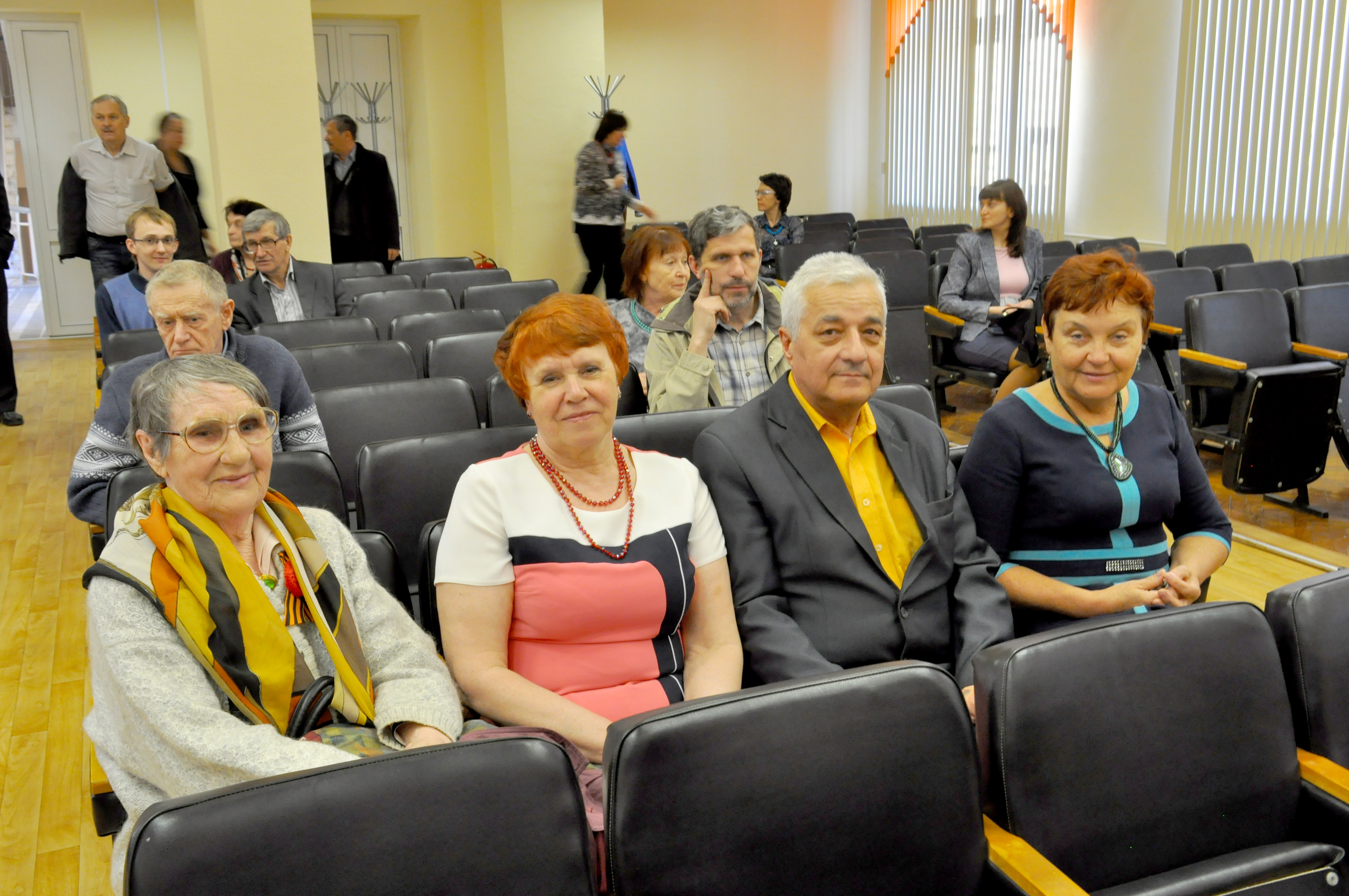 2015 год, 8 мая. В конференц-зале Института физики им. Л.В. Киренского Сибирского отделения Российской академии наук (ИФ СО РАН) перед началом концерта, посвященного 70-тию Победы в Великой Отечественной войне (1941-1945 гг.). Слева направо: В.И. Блинова, ветеран института; Е.Д. Кармацкая, заведующая хозяйством института; В.Н. Курилов, заведующий отделом материально-технического снабжения; Г.В. Шиян, ведущий инженер по эксплуатации зданий.