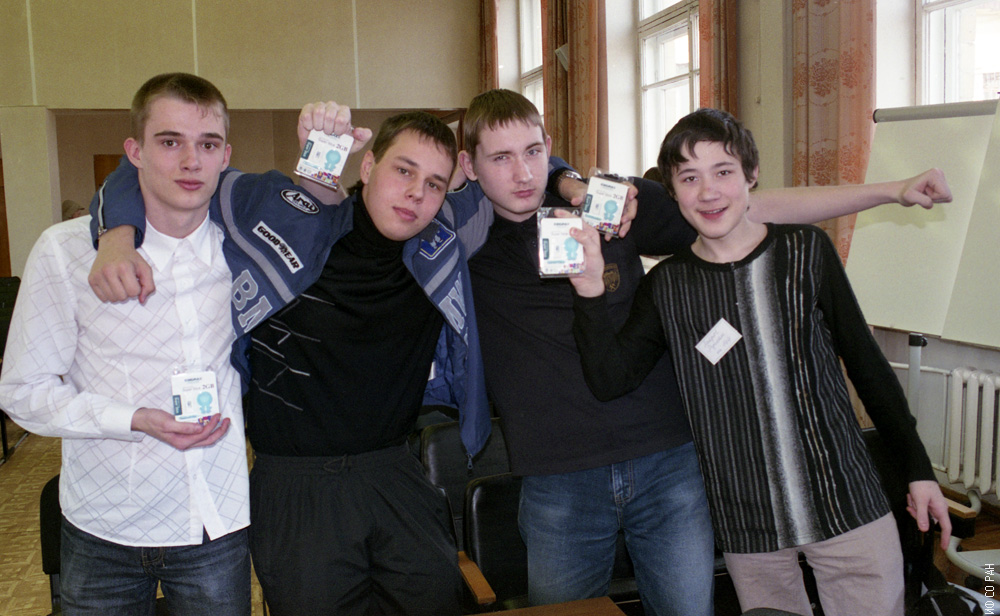 Участники научно-популярной викторины по физике среди учащихся школ Красноярска и Красноярского края, посвященной 100-летию со дня рождения академика Л.В. Киренского. Команда школы № 144. Слева направо: Двойников Максим, Герасёв Иван, Титов Алексей, Япаров Руслан, март 2009 года.