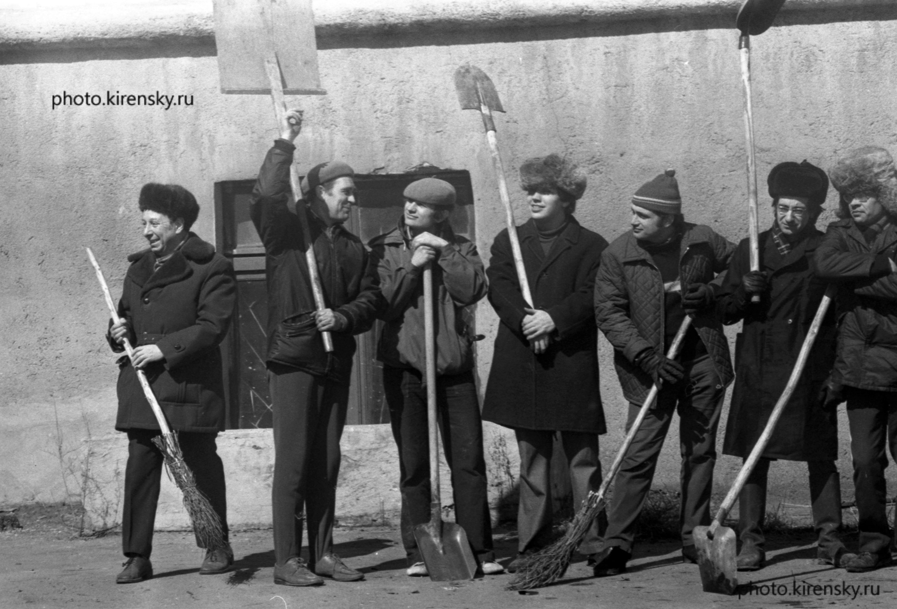 1978 год. Ежегодный традиционный весенний субботник в Академгородке. Сотрудники лаборатории радиоспектроскопического структурного анализа Института физики им. Л.В. Киренского Сибирского отделения Академии наук СССР. Слева направо: А.Г. Лундин, Э.П. Зеер, В.М. Бузник, М.А. Попов, А.И. Кригер, А.И. Лифшиц, Г.Ф. Лыбзиков. Красноярск.