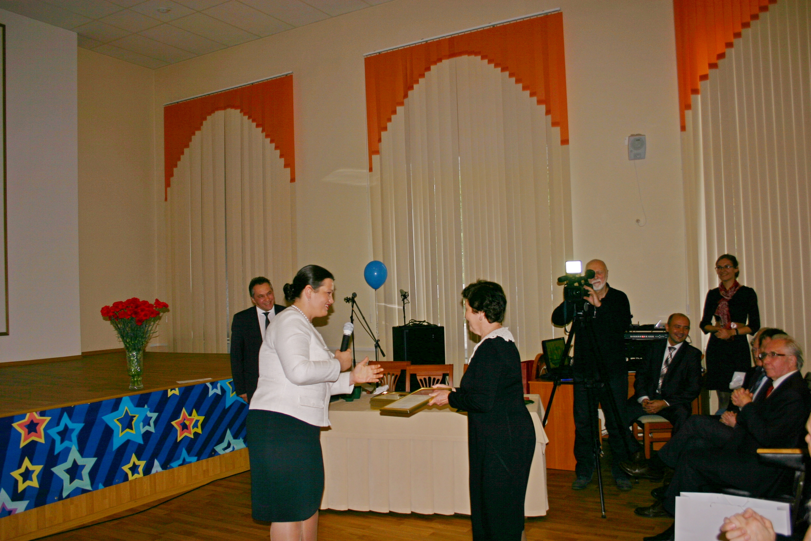 12 октября 2016 года. Конференц-зал ИФ СО РАН. Расширенное заседание ученого Совета, посвященное 60-летию образования института с участием сотрудников института, представителей администраций города и края, директоров предприятий-партнеров, директоров подразделений ФИЦ КНЦ СО РАН и других гостей. Благодарственное письмо Губернатора Красноярского края вручается Миннибики Мирзагабдулловне Матыгулиной, бухгалтеру института. Письмо вручает Н.В. Рязанцева, заместитель председателя правительства Красноярского края.