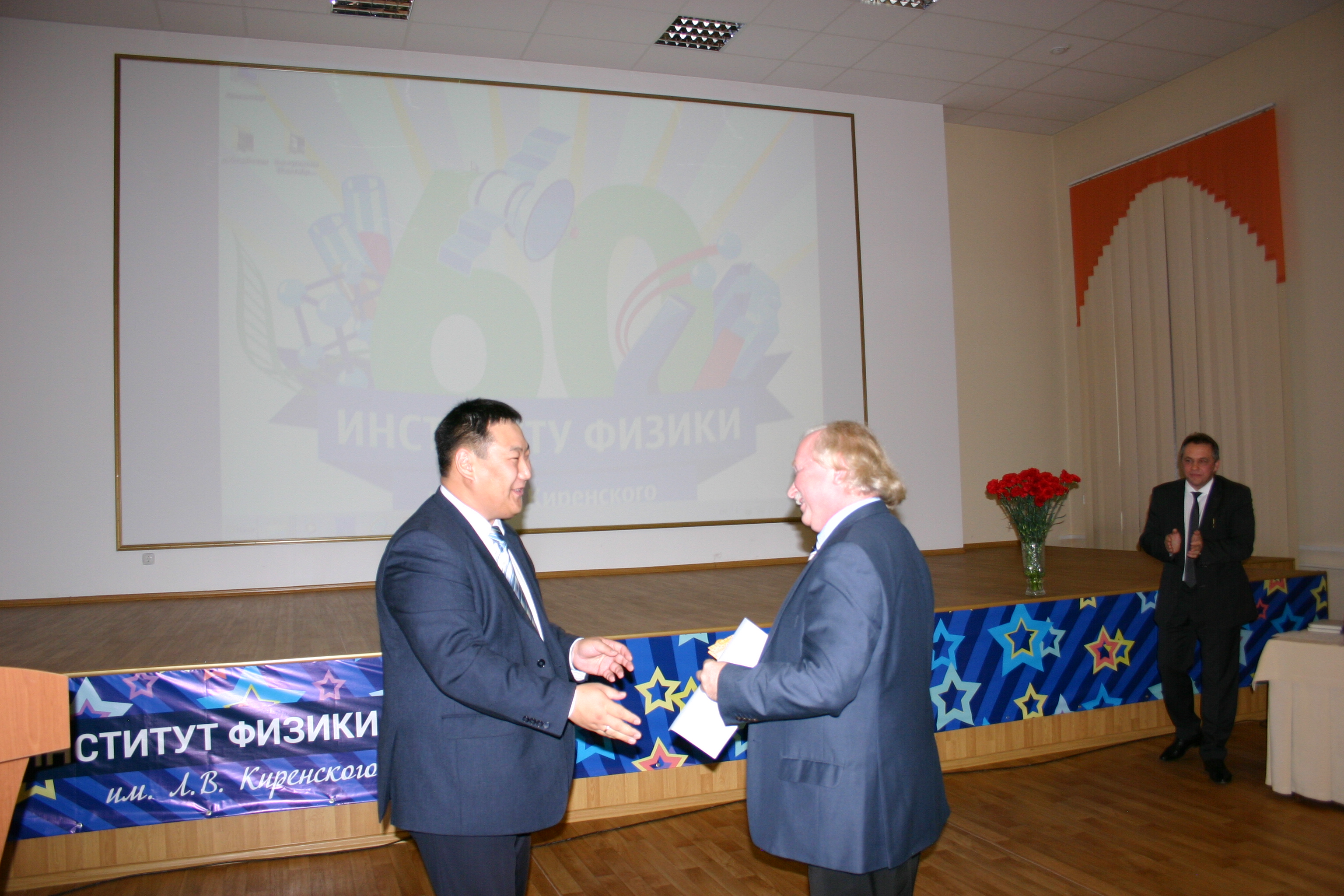 12 октября 2016 года.В конференц-зале Института физики им. Л.В. Киренского Сибирского отделения Российской академии наук (ИФ СО РАН) состоялось расширенное заседание ученого Совета, посвященное 60-летию образования института с участием сотрудников института, представителей администраций города и края, директоров предприятий-партнеров, директоров подразделений Федерального исследовательского центра «Красноярский научный центр Сибирского отделения Российской академии наук» (ФИЦ КНЦ СО РАН) и других гостей. Ю.Е. Шишкин (слева), начальник управления образования Амгинского улуса (Якутия), вручает Благодарственное письмо администрации улуса заместителю директора по научной работе института А.Н. Втюрину.