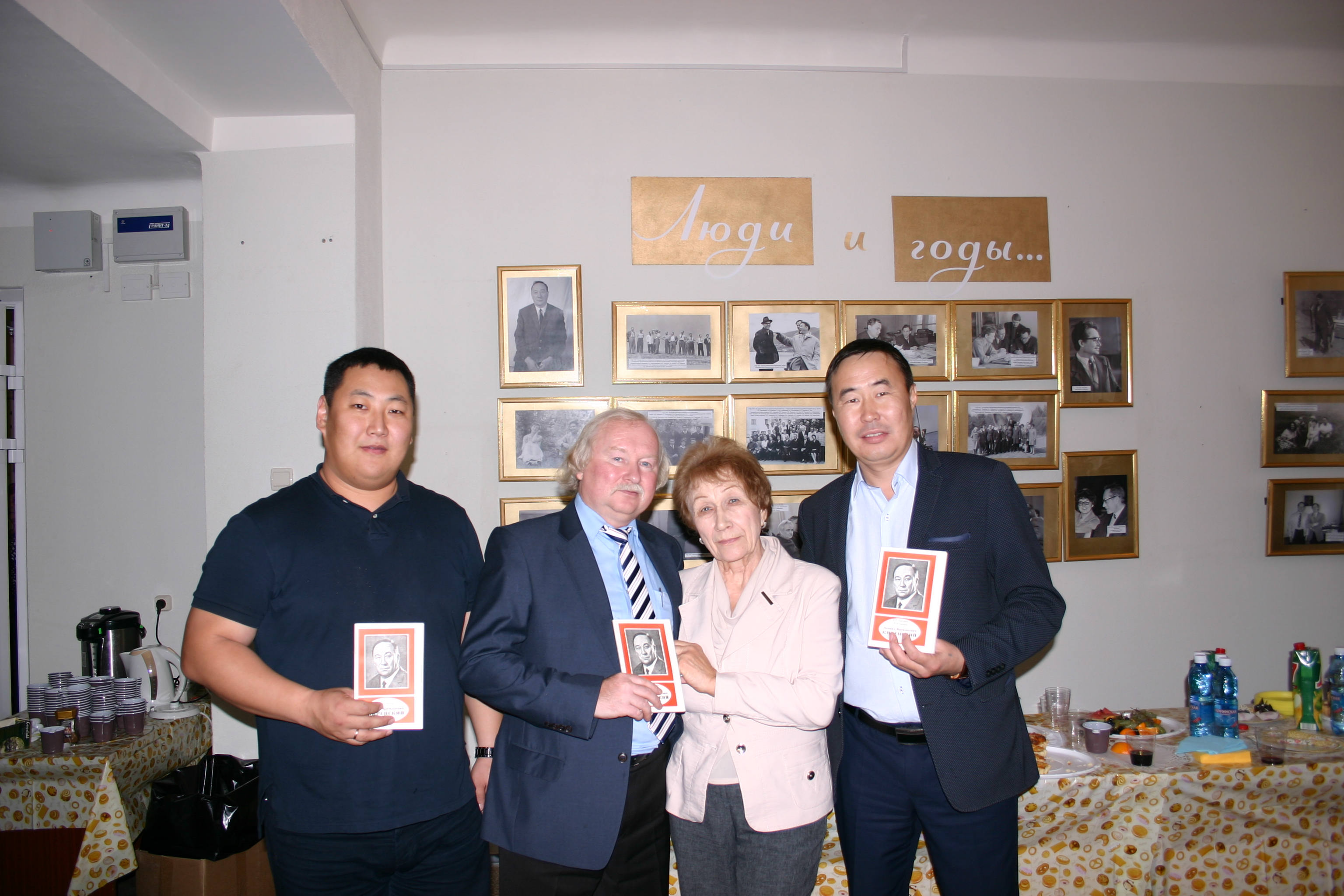 Гости из Якутии: Ю.Е. Шишигин, начальник управления образования Амгинского улуса (слева), П.И. Лебедев, заместитель главы администрации Амгинского улуса (справа) и сотрудники института: А.Н. Втюрин и Л.М. Хрусталева. Красноярск.